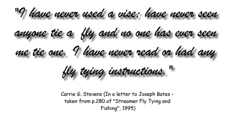 The words of a trailblazer. How fortunate we are to reap the benefits of a road paved by innovators before us, such as Mrs. Stevens. We have a treasury of her wonderfully artistic patterns, left for us to recreate and use. Flies as lethal as they are beautiful. Her unique methods and patterns are being rediscovered today through books like "Forgotten Flies" and "Carrie Stevens - Maker of Rangeley Favorite Trout and Salmon Flies". Her legacy, still being pieced together with every additional 'previously unpublished' Carrie Stevens streamer pattern uncovered. The