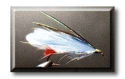 - Wing: 4 strands peacock herl, then 2 gray hackles flanked by 2 blue-dyed badger hackles.